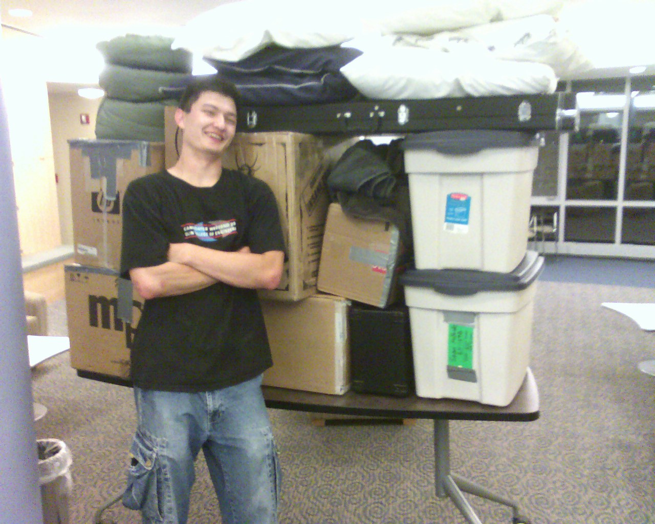 Dean was the last from my suite to get here (the others being Brain, Rob, Brendan, and Matt). Dean and I worked on carting over the rest of our stuff. We didn’t have a dolly, so we used a table with wheels instead. It ended up working out, and thankfully, the table didn’t break in half from the weight.