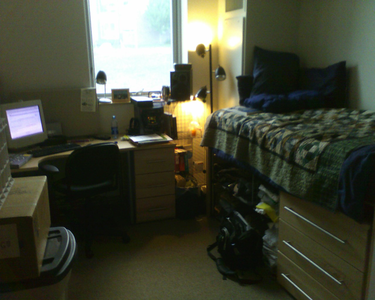 Finally, after a whole lot of work, my room is pretty much complete (sans some boxes that need to be taken back to storage once it’s all clean.) I managed to wedge my bed into a spot that was a REALLY tight fit. But I’m glad I was able to do it because it gives me a WHOLE lot more floorspace and lets me put my desk to i can look out the window. Woot.