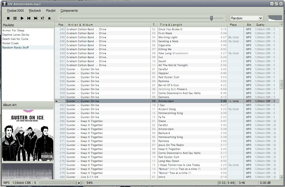 Finally, after about four hours of searching forums for the poorly documented and collected plugins, I finally have Foobar looking pretty spiffy. I have album art displaying for all my stuff, a spectrum analyzer thingy, nice columns of info for the library, playlist panel, etc. Cool. Even with all this stuff on and music playing, it still takes up 8 megs of RAM. Very cool. I’m a fan of the minimal, but I don’t recommend it for non-power users. Still, it’s better than iTunes since it doesn’t start stuttering if I try to run any other program. Hooray.