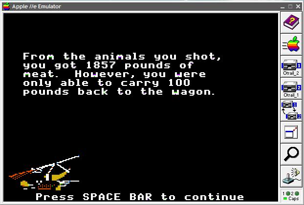 Oregon trail is the best game ever. I just wish I could carry more meat. Go here to download the emulator and the game and relive the glory.