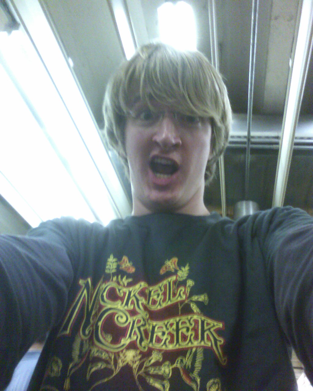 I went to the concert with my good friends Brian and Lindsay. We left early and ate at Bertucci’s (yummy yummy Italian) and then took the T down to Park Street station and the Orpheum theatre, where we proceded to have our minds blown. Below is a photo of me in my new tshirt with my mind blown by the incredible talent that is Nickel Creek.