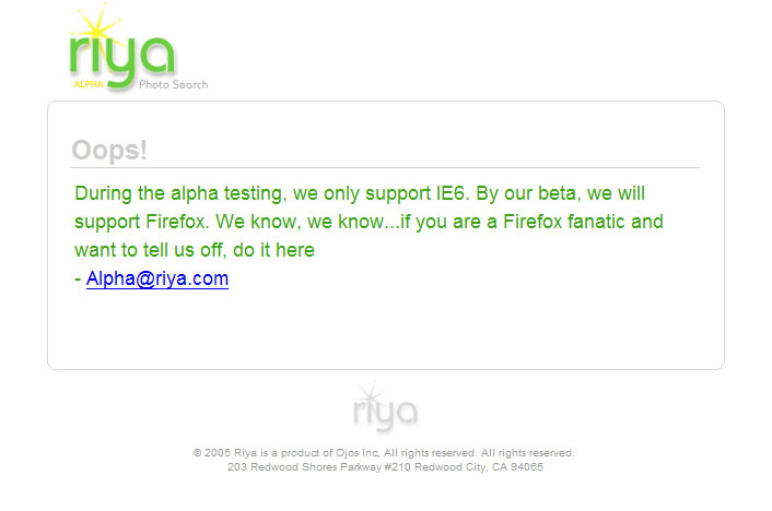 Hmmm. How awkward. Not only am I greeted with a non-optimal browsing experience in the (in my opinion) Web2.0 browser of choice, but they have apparently broken something so badly in Firefox that I am not even allowed to see the results. This gets bad marks for usability, even for a public alpha. My enthusiasm is significantly curbed.