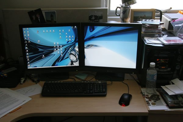 Finally, I just wanted to show off a juicy photo of my new monitor setup. I just purchased a second 19″ Ag Neovo flat-panel to go with my original one, so I now have a combined total of 2.6 million beautiful pixels. It’s really going to streamline graphic design and coding workflow for this summer. Pretty.